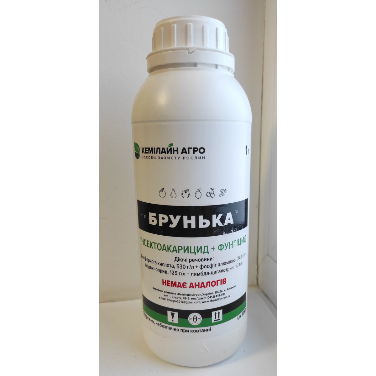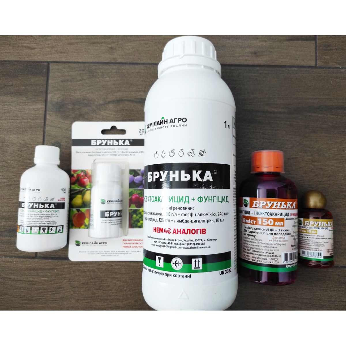 Універсальний препарат Брунька поєднує функції фунгіциду, інсектициду і акарициду. Засіб застосовується для обприскування саду з метою захисту культур від комплексу комах-шкідників, що зимують, і захворювань. При розпаді активних сполук препарату Брунька виділяються такі мікроелементи, як фосфор, алюміній та мідь, які служать для подальшої стимуляції розвитку рослин. Обробку проводять 2 рази за сезон: першу – ранньою весною, поки бруньки не встигли розкритися, другу – пізно восени, після опадання листя, коли рослина готується до зимівлі. Інсекто-фунгіцид Брунька містить у складі діючі речовини: фосфіт алюмінію, фосфористу кислоту, імідаклоприд та лямбда-цигалотрін. Фосфід алюмінію та фосфорна кислота надають токсичну дію на нервову та дихальну систему комах та блокують проростання спор патогенної грибниці. Імідаклоприд, потрапляючи в організм шкідників, здійснює паралітичну дію на їх нервову систему і пригнічує функцію травлення. Максимальна активність речовини спостерігається через 3-5 днів після обробки. Тривалість захисної дії зберігається досить довго – близько місяця. Лямбда-цигалотрін є інсектицидом контактної дії, ефективним проти багатьох шкідників, у тому числі кліщів. Механізм його дії заснований на пригніченні функцій нервової системи при попаданні всередину організму комахи. Інсектоакарицид Брунька ефективно використовується для захисту яблуні, груші, персика, абрикосу, сливи, вишні, черешні, троянд, смородини, малини, винограду, самшиту, хвойних рослин від щитівки, ложнощитівки, довгоносика, попелиці, трипсу, білокрилки, п'ядениці, листовійки, плодожерки, всіх видів рослиноїдних кліщів, червеця, совки, молі, листоблішок, а також проти парші, борошнистої роси, моніліозу, фузаріозу, альтернаріозу, гнилі, мілд'ю, оїдіуму, плямистості листя, іржі, некрозу, коккомікозу, мозаїки, аскохітозу та багатьох інших паразитів та патогенів.