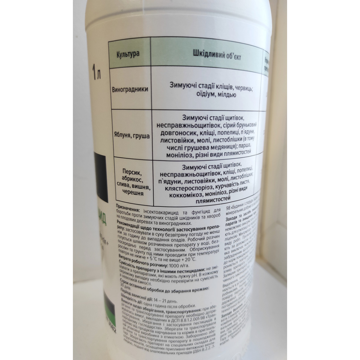 | Виноградники, чорна смородина, малина | Зимуючі стадії комах: щитівки, ложнощитівки, довгоносики, трипси, деревоточці, черв'яки, листовійки, мідяниці, п'ядениці, листоблішки, захворювання: антракоз, мілдью, фузаріоз, оідіум, плямистий некроз, жовта мозаїка, фомопсис, борошниста роса, гнилі, плямистість листя. | Обприскувати двічі за вегетацію: до розпускання бруньок навесні та після опадання листя восени (20 мл на 10 л води). | 2-4 рази на рік |